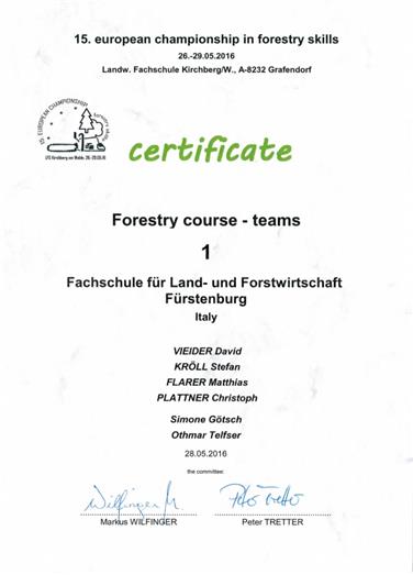 Besonders gut verlief der erste Teil der Europameisterschaft, welcher dem forstlichen Theorieunterricht gewidmet war. In einem Rundkurs mussten die Schüler als Team 16 Teilaufgaben lösen, welche forstliches Wissen und Geschick verlangten. Sie mussten forstliche Kennzahlen wie Stammzahlen, Volumen, Grundflächen und Höhen ermitteln, Baum-, Holz-, Tierarten und Schadbilder bestimmen sowie Erste-Hilfe-Maßnahmen durchführen. In dieser Disziplin konnten die Fürstenburger Schüler erstmals Platz eins erreichen und stolz die Siegertrophäe entgegennehmen.
