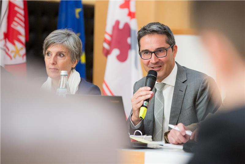 LH Kompatscher und Carmen Springer von der Landesabteilung Mobilität bei der heutigen Sitzung der EUSALP-Aktionsgruppe Mobilität - Foto: LPA/ohn