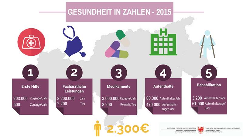 Pro Jahr werden laut dem Landesgesundheitsbericht 2015 in Südtirol 3 Millionen Medikamentenrezepte, 203.000 Zugänge zur Notaufnahme, 470.000 akute und 61.000 postakute Aufenthaltstage sowie 8,2 Millionen fachärztliche Leistungen verzeichnet. Die Leistungsempfänger sind zu einem Drittel chronisch Kranke (32 Prozent der Bevölkerung), darunter unter anderem Diabetiker (4 Prozent) sowie Patienten mit Bluthochdruck (15 Prozent), mit Atemwegserkrankungen (4 Prozent) oder mit einem Tumor (5 Prozent). Die Gesundheitsversorgung der Südtiroler schlägt in Summe mit einer öffentlichen Pro-Kopf-Ausgabe von 2.300 Euro pro Jahr zu Buche.