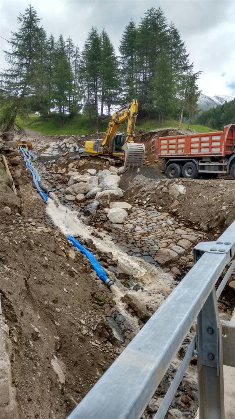 Die Landesstraße in Langtaufers (LS 49) wurde beim schweren Unwetter am 11. Juli im Bereich des Pedrossbaches und bei der Brücke über den Fallerbach vollständig überschwemmt. „Umgehend war der Straßendienst im Einsatz, um mit Hilfe von Bagger und Lastwagen die Straße und die Bäche vom Schlamm und Geröll zu befreien“, berichtet der Direktor der Landesabteilung Straßendienst Philipp Sicher. Bereits am 12. Juli konnte die Straße wieder für den Verkehr freigegeben werden. Die Unwetter hatten jedoch weitere Schäden an den Widerlagern der Brücken angerichtet. „Derzeit arbeiten die Mitarbeiter der Landesabteilungen Straßendienst und Wasserschutzbauten an der Behebung dieser Schäden“, sagt Sicher. Dabei wird beim Pedrossbach das zerstörte Steinpflaster durch ein Neues ersetzt und eine neue Ufermauer aus Zyklopensteinen wird die Straße zukünftig vor Überschwemmungen schützen. Im Fallerbach wird eine neue Sperre errichtet und ein zusätzliches Steinpflaster schützt die Brücke vor Unterspülung. Die beiden Baumaßnahmen werden laut Sicher derzeit zügig umgesetzt und verursachen keine größeren Verkehrsbeeinträchtigungen. Sämtliche Eingriffe werden nach der Errichtung von Zufahrtsrampen außerhalb der Fahrbahn durchgeführt.