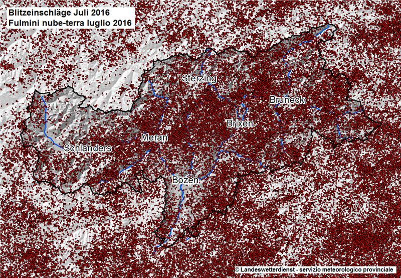 Diese hohe Blitzaktivität spiegelt sich auch in den Niederschlagsdaten wider: Im Großteil des Landes war der Juli überdurchschnittlich nass, von plus 10 Prozent in Schlanders bis plus 80 Prozent in Meran im Vergleich zu den Mittelwerten. Nur im Raum Bozen blieb es etwas trockener.