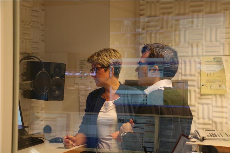 "Der Zivilschutz befindet sich in einer Übung": Amtsdirektor Walcher und Karin Unterhofer im Senderaum der Verkehrsmeldezentrale. Foto. LPA/Maja Clara