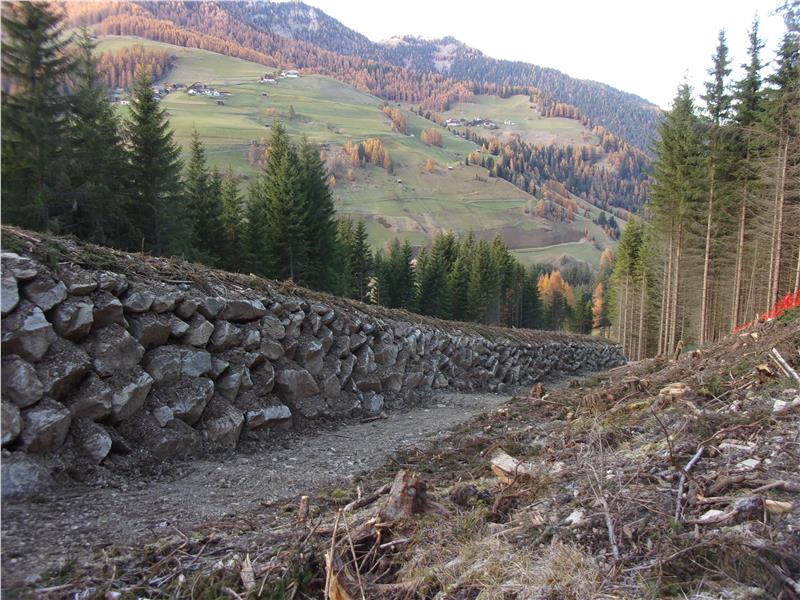 Da ein technischer Eingriff im oberen Teil des Einzugsgebietes des Rü de Pecëi für die Experten des Amtes für Wildbach- und Lawinenverbauung Ost nicht in Frage kam, entschied man sich für den Bau von zwei Ablenkdämmen oberhalb des Weilers Pecëi. Rund 160 bzw. 145 Meter lang und drei bis fünf Meter hoch sind die beiden Bauwerke, die bergseitig mit Zyklopensteinen verstärkt und vor wenigen Wochen fertig gestellt worden sind.