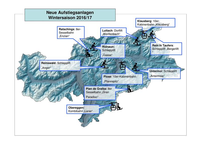 In Luttach im Ahrntal wurde der neue Dorflift „Weißenbach“ errichtet. In Untermoi wurde der Schlepplift „Antermoia“ ersetzt. Erneuert wurde der Schlepplift „Bergerlift“ in Rain in Taufers. In Reinswald im Sarntal wurde der Schlepplift „Anger“ ersetzt. Ebenfalls durch einen neuen Lift ersetzt wurde der Schlepplift „Gasse“ in Ridnaun.
