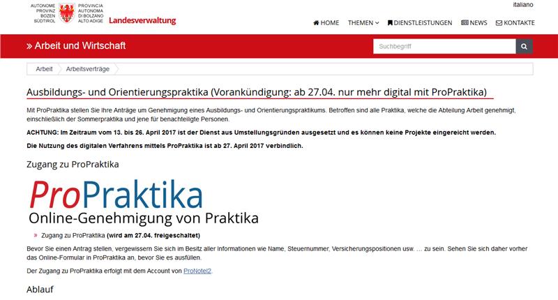 Die Landesabteilung Arbeit hat gemeinsam mit jener der Informationstechnik ein Verfahren entwickelt, um Ameldung und Genehmigung für Ausbildungs- und Orientierungspraktikas online abzuwickeln. Davon betroffen sind alle Betriebspraktika, welche die Abteilung Arbeit genehmigt, einschließlich der Sommerpraktika und jene für benachteiligte Personen. Der Dienst ist über das Portal ProPraktika unter dem Link www.provinz.bz.it/propraktika abrufbar.