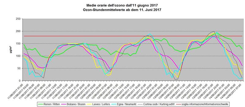 Mit dem Anstieg der Temperaturen und der Sonneneinstrahlung sind in den vergangenen Tagen die Ozonkonzentrationen gestiegen. Darauf weist der Direktor des Labors für physikalische Chemie der Landesagentur für Umwelt, Luca Verdi, hin. Die Informationsschwelle liegt, was die Ozonkonzentration betrifft, bei 180 Mikrogramm Ozon pro Kubikmeter Luft. Am 13. Juni 2017 wurde demnach an der Messstation in Neumarkt die Informationsschwelle für Ozonkonzentration von 21 bis 22 Uhr mit einem Stundenmittelwert von 197 Mikrogramm je Kubikmeter (µg/m³) überschritten, ebenso wie in Kurtinig an der Weinstraße von 18 bis 21 Uhr mit einem höchsten Stundenmittelwert von 200 µg/m³, in Bozen von 20 bis 21 Uhr mit einem Stundenmittelwert von 181 µg/m³, in Leifers von 18 bis 22 Uhr mit einem höchsten Stundenmittelwert von 192 µg/m³ und am Ritten von 19 bis 23 Uhr  mit einem höchsten Stundenmittelwert von 193 µg/m³.