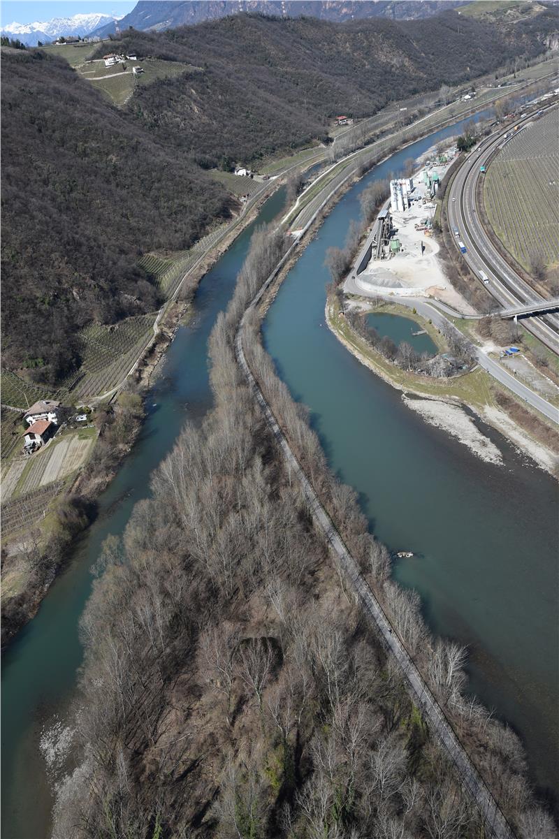 Das Biotop Fischerspitz südlich von Bozen ist eine langgezogene Landzunge am Zusammenfluss von Etsch und Eisack. Foto: LPA/Amt Wildbach- und Lawinenverbauung Süd