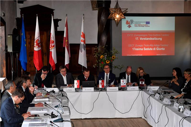 Für eine gemeinsame und nachhaltige Verkehrspolitik auf der Brennerachse hatten sich die Landeshauptleute der drei Euregio-Länder bei dem Verkehrsgipfel im vergangenen Jänner in München ausgesprochen. Im Mittelpunkt soll dabei die Verlagerung des Schwerverkehrs von der Straße auf die Schiene stehen. Diesen gemeinsamen Standpunkt bekräftigte der Vorstand des Europäischen Verbunds für territoriale Zusammenarbeit EVTZ "Europaregion Tirol-Südtirol-Trentino" bei seiner heutigen 17. Sitzung auf Schloss Prösels bei Völs am Schlern, wo sich der Vorstand auch auf eine Reihe gemeinsamer Projekte verständigte-
