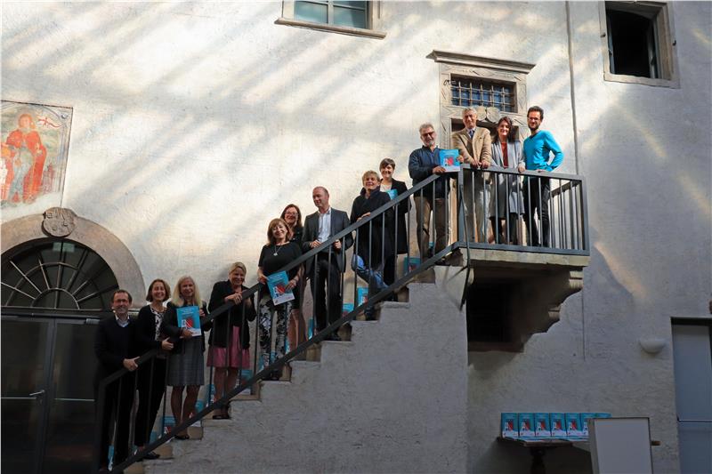 Von Tor zu Tür auf Schloss Maretsch: Vorstellung der Kulturberichte 2018; im Bild einige der Autorinnen und Autoren mit Vertreterinnen und Vertretern der Kulturabteilung. Foto: LPA/Maja Clara