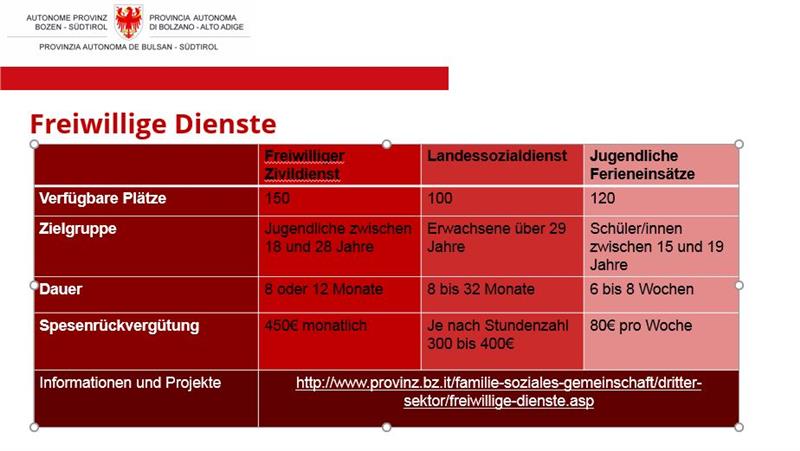 Der Sozialdienst hingegen bietet Erwachsenen ab 29 Jahren die Möglichkeit, zur sozialen oder kulturellen Entwicklung beizutragen. Er kann mindestens acht bis 32 Monate dauern und wird monatlich je nach Stundenanzahl mit 300 bis 400 Euro vergütet. "Vor allem im Sozialen schätzen es die Organisationen, wenn die Verträge verlängert werden können, weil diese Freiwilligen dann schon mehr Erfahrung in ihre Arbeit einbringen als Neulinge", erklärt der Landeshauptmann.