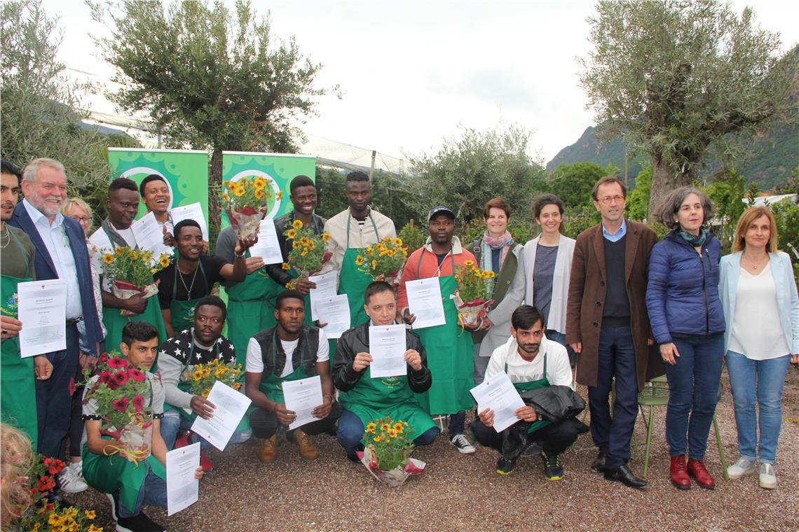Aus sieben verschiedenen Ländern kommen die 13 Asylbewerber, die den Lehrgang "Blühende Sprache" abgeschlossen und gestern (21. Mai) Abend in der Gärtnerei Reider in Bozen ihre Zertifikate erhalten haben. Der Lehrgang mit bildungs- und integrationspolitischer Zielsetzung bereitet auf den Arbeitsmarkt in Südtirol vor.