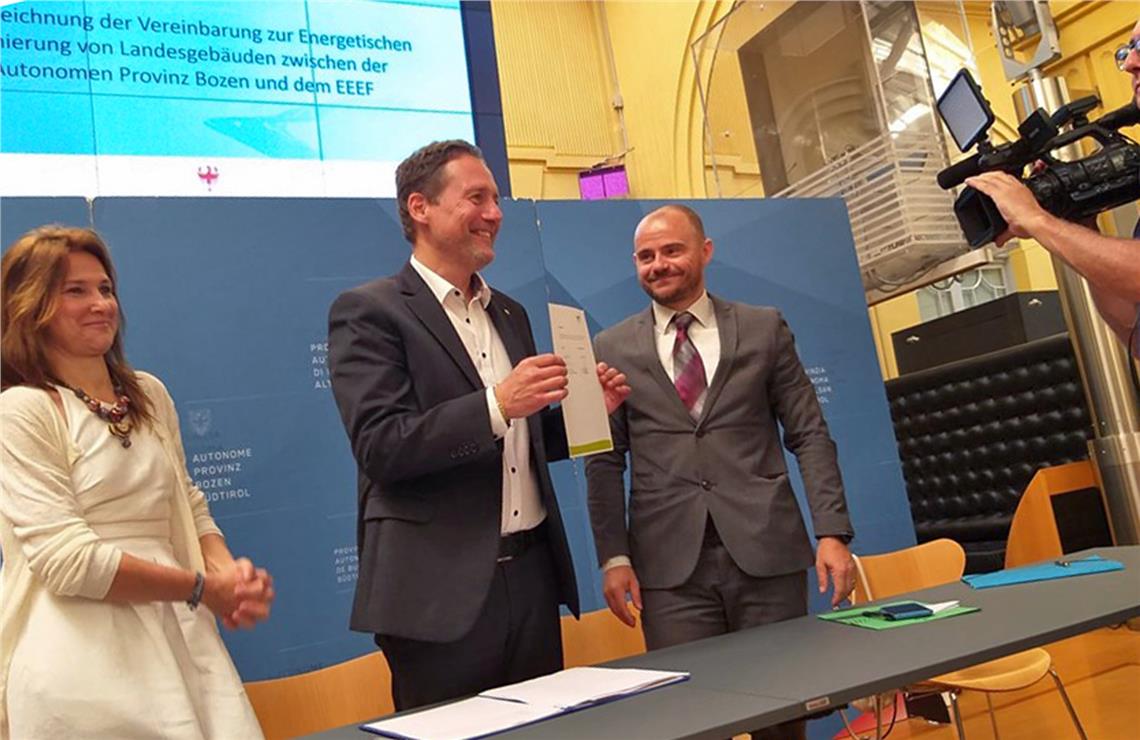 27 Gebäude in Landesbesitz sollen in Kürze weniger Energie verbrauchen. Für die damit verbundenen Maßnahmen würden Investitionen von rund 56 Millionen Euros anfallen. Deshalb sollen nun Unternehmen die Arbeiten an Dächern, Fassaden, Fenstern, Beleuchtungs- und Heizungssystemen für das Land übernehmen. Dafür ermöglicht ihnen das Land Zugriff auf Gelder aus dem von der Europäischen Kommission eingerichteten Fonds eeef (European Energy Efficiency Fund www.eeef.eu) und die Unterstützung aus dem Program Horizon 2020 ELENA und sie bekommen umfassende Beratung, um das Investitionsprogram vorzubereiten. Bautenlandesrat Massimo Bessone hat das Vorhaben in Form einer öffentlich-privaten Partnerschaft am 13. Juni, in Bozen gemeinsam mit Generalsekretär Eros Magnago, dem Energy-Manager des Landes Daniel Bedin, der eeef-Vertreterin Lada Strelnikova, dem Direktor des Instituts für erneuerbare Energien der Europäischen Akademie (Eurac) Wolfram Sparber und dem Präsidenten der Agentur PensPlan Invest SGR Alexander Gallmetzer unterzeichnet.
