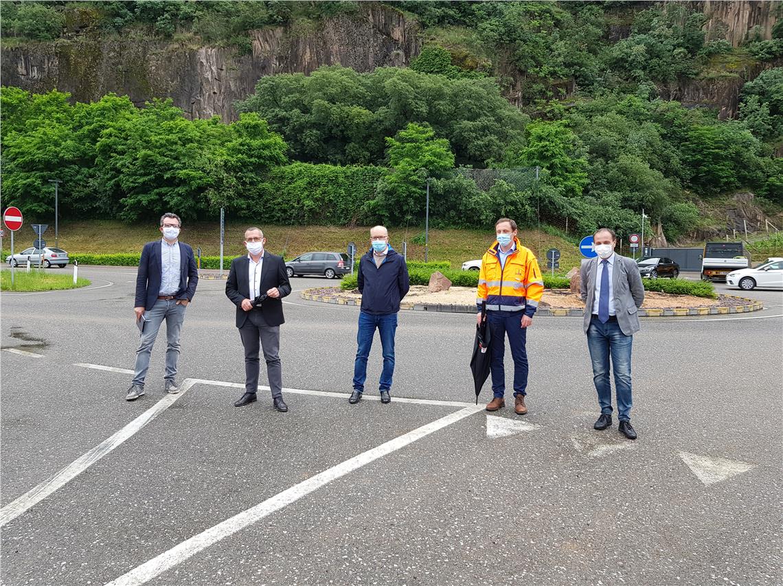 Die Arbeiten für den neuen Kreisverkehr in Leifers Nord wurden übergeben und können nun anlaufen. Vor Ort: Seppi, Bianchi, Pagani, der Vertreter der Baufirma Michael Goller und LR Vettorato (Foto: LPA)