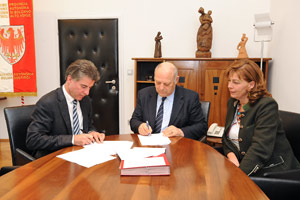 Il presidente della LUB, Bergmeister, il presidente Durnwalder e l'assessora Kasslatter Mur hanno sottoscritto l'accordo (FOTO:USP/Pertl)