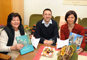 Festeggiata la 150a coppia del progetto di Volontariato per le lingue: da sx Monika Tribus, il vicepresidente Christian Tommasini, e Paola Barbieri (FOTO: USP/A.Pertl)