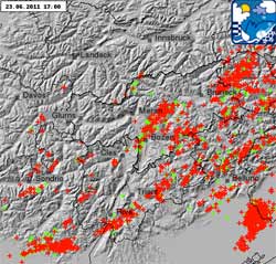 Sul sito internet www.provincia.bz.it/meteo è da poco disponibile un'immagine in tempo reale che rappresenta il numero e la posizione dei fulmini che si stanno scaricando sul territorio provinciale e sulle regioni limitrofe.