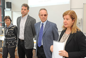La direttrice dell'Ufficio Affari di Gabinetto Elisabeth Spergser (da dx), il presidente di EURAC Werner Stuflesser, Adi Pfitscher di Human Rights International e Sigrid Prader, direttrice del Museo delle donne di Merano presentano il convegno.