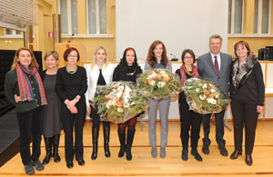 Le dottoresse premiate per le loro tesi sulle pari opportunità assieme all'assessore Bizzo (2° da dx) e alla presidente e vicepresidente della Commissione Oberhammer (4a da sx) e Toffol (1a da sx) (FOTO: USP/A.Pertl)