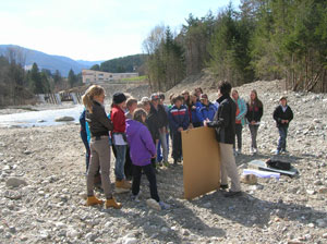 Gli alunni delle scuole elementari in visita all'area di intervento sulla Rienza a Perca.