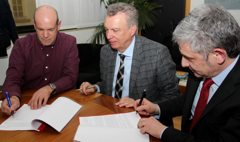 L'assessore Roberto Bizzo durante la firma dell'accordo fra rappresentanti dei lavoratori e l'amministratore delegato di SIMETEL