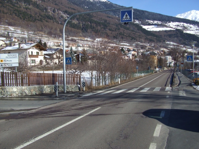 Segnaletica e illuminazione adeguata per gli attraversamenti pedonali: nella foto "zebre" sicure a Malles