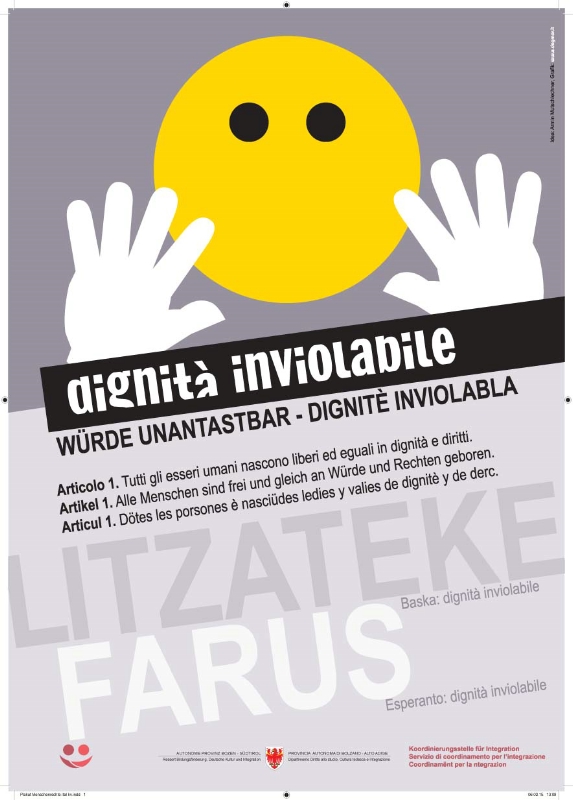 Una campagna di sensibilizzazione su "Diritti umani e integrazione in Alto Adige" viene organizzata dal Servizio di coordinamento per l'integrazione del Dipartimento Diritto allo studio, cultura tedesca e integrazione della Provincia. I Comuni altoatesini sono invitati ad esporre appositi manifesti tra il 16 febbraio e il 16 marzo sul territorio di loro competenza.