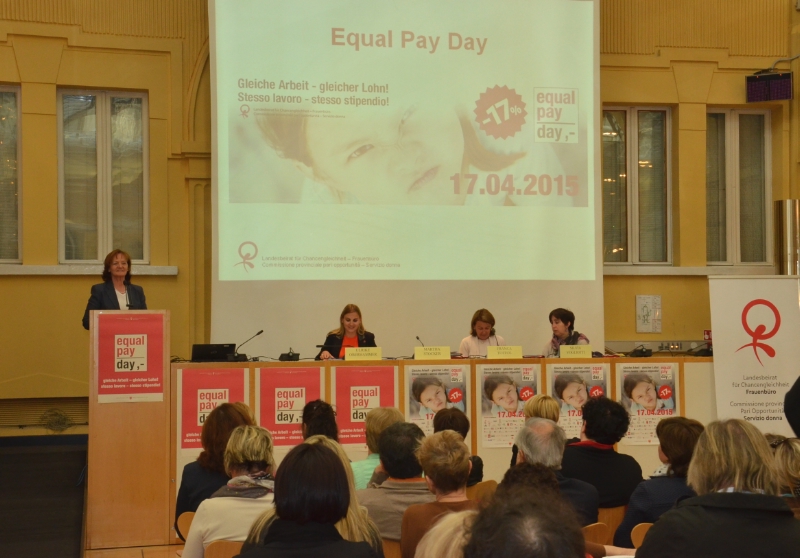 L'edizione 2015 dell'Equal Pay Day, con cui Commissione provinciale pari opportunità ed il Servizio donna assieme a 59 organizzazioni il 17 aprile intendono sensibilizzare sulle differenze salariali fra donne e uomini e sull'equa suddivisione dei compiti familiari, è stata presentata oggi mercoledì 15 aprile a Palazzo Widmann a Bolzano dall'assessora provinciale alle pari opportunità e lavoro Martha Stocker e dai vertici della Commissione provinciale per le pari opportunità per le donne, Ulrike Oberhammer e Franca Toffol, insieme a Silvia Vogliotti di AFI-IPL.
