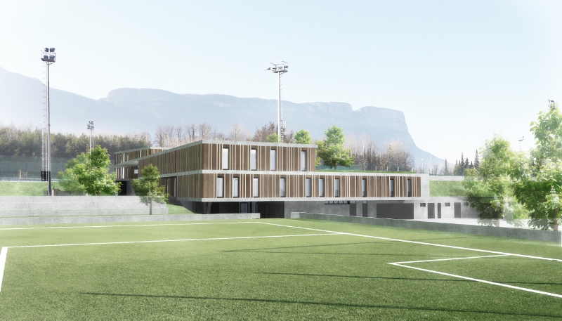 L'intervento, come spiega l'arch Wolfgang Simmerle, si colloca ortogonalmente fra i due campi sportivi esistenti. L'edificio sarà costruito con struttura portante in cemento armato e tamponamenti esterni in vetro e legno.