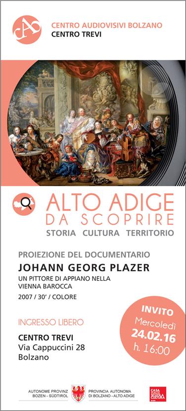 Domani, mercoledì 24 febbraio 2016 ore 16.00, al Centro Trevi, presentazione e proiezione del film “Johann Georg Plazer. Un pittore di Appiano nella Vienna barocca” con la partecipazione del regista Lucio Rosa e del consulente artistico Hanns-Paul Ties. Sarà, inoltre, presentato il progetto Artoteca in collaborazione con l’Associazione degli artisti della provincia di Bolzano. Moderazione a cura di Matteo Marzano. Ingresso libero.