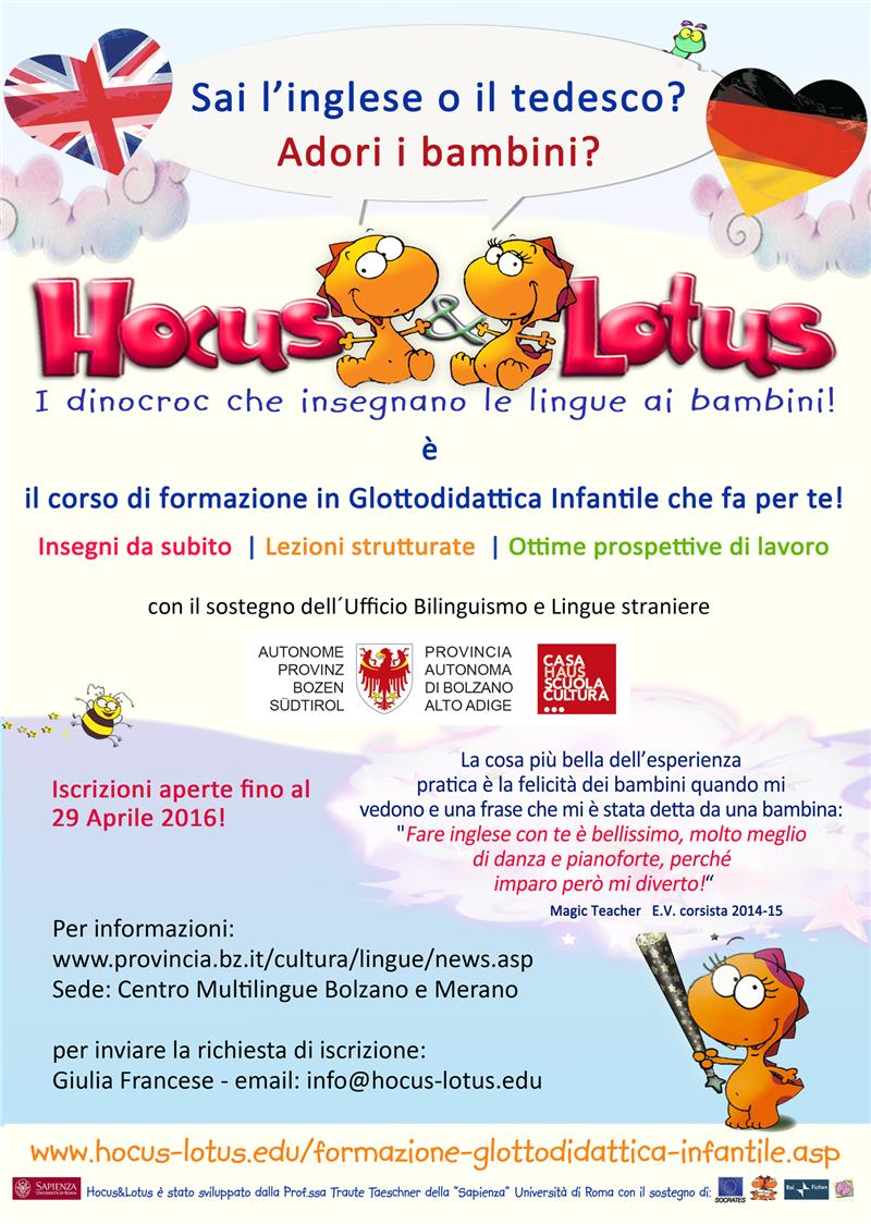 A venti persone l’Ufficio Bilinguismo e Lingue straniere del Dipartimento Cultura Italiana della Provincia offre la possibilità di frequentare un corso di formazione per diventare “magic teachers”, ovvero per insegnare le lingue con i format narrativi di “Hocus & Lotus“ (www.hocus-lotus.edu). L'attività insegnata nel corso potrà essere utilizzata dai corsisti, con prospettive lavorative, sia nelle scuole che in altre istituzioni educative: asili nido, centri estivi, gruppi gioco o altro.