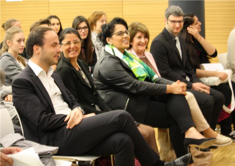 Hanno preso parte alla cerimonia l’assessore provinciale alla scuola e cultura di lingua tedesca, Philipp Achammer, gli intendenti scolastici Nicoletta Minnei e Peter Höllrigl, il sindaco di Merano Paul Rösch, oltre ai relatori, in particolare il professor Christian Zelger che ha trattato il tema “Europa in der Welt – Die Welt in Europa”, il presidente della Camera di Commercio, per lungo tempo europarlamentare, Michl Ebner, che ha parlato sul tema “L’Europa e la sua responsabilità nei confronti del mondo” ed il consigliere provinciale, Riccardo Dello Sbarba, che ha svolto una relazione dal titolo “Può l’Europa essere ancora un modello culturale e sociale per il mondo?”.