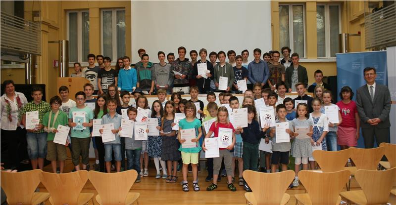 I primi cinque di tutte le categorie del concorso "Il canguro della matematica" stati premiati questa mattina nel corso di una cerimonia che si è svolta a Palazzo Widmann ed alla quale hanno preso parte l'intendente scolastico Peter Höllrigl e dall'ispettrice Marta Herbst. Numerosi i genitori e gli insegnanti presenti alla cerimonia.