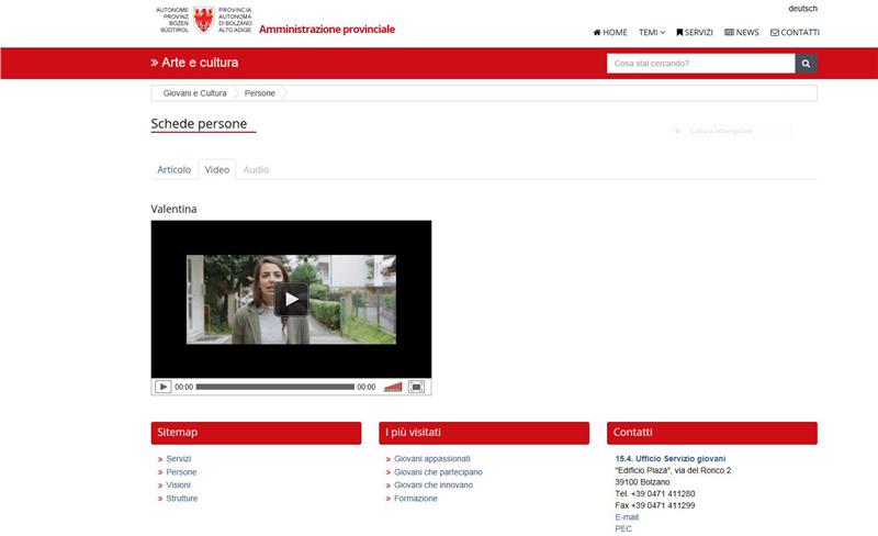 La prima protagonista a raccontarsi è Valentina Vizzi, operatrice presso il Centro giovani Tilt a Sinigo. La videopillola che la racconta è visibile al link http://www.provincia.bz.it/arte-cultura/giovani/schede-persone.asp?pers_action=4&pers_article_id=556417