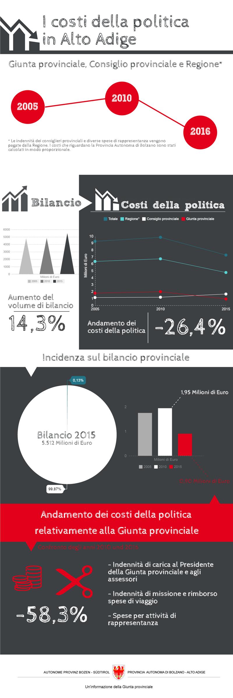 “Con questo provvedimento – ha commentato il presidente Arno Kompatscher – prosegue l’impegno che avevamo preso all’inizio della legislatura per quanto riguarda i costi della politica”. Valutando tutto il pacchetto, compresa la Regione e il Consiglio provinciale, il taglio è stato superiore al 25%, dato che si è passati da oltre 9,2 milioni di euro a poco più di 7 milioni di euro. “Se però ci limitiamo alla Giunta provinciale – ha aggiunto Kompatscher - il trend è ancora più virtuoso. Rispetto al 2010, infatti, abbiamo eliminato completamente le spese riservate, abbiamo ridotto al minimo le spese di rappresentanza, che ora sono circa un decimo del valore iniziale, e abbiamo sostanzialmente dimezzato i costi legati alle indennità di carica e alle spese di viaggio”