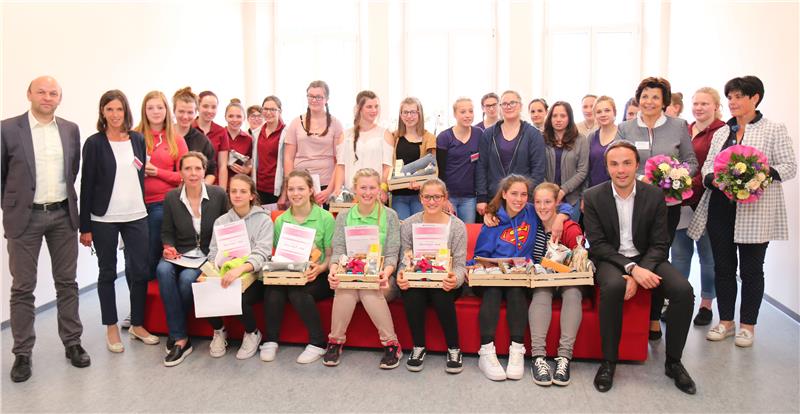 Le vincitrici insignite dall'assessore provinciale Achammer oggi, 4 maggio, presso la Scuola Aslago, dove si è disputato il contest.