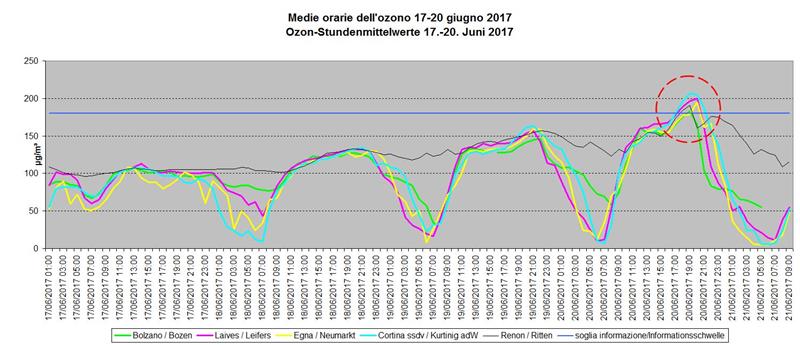 I temporali della scorsa settimana avevano fatto rientrare nella norma i valori dell'ozono in Alto Adige, ma le torride temperature degli ultimi giorni accompagnate da una grande esposizione solare degli ultimi giorni li hanno fatto risalire. Nel corso della giornata di ieri (lunedì 20 giugno), la soglia di informazione di 180 microgrammi di ozono per metro cubo d'aria è stata superata in cinque delle stazioni di misura presenti sul territorio altoatesino. Il valore più alto è stato quello di Cortina sulla strada del vino, con una concentrazione oraria massima di 207 microgrammi per metro cubo tra le 19 e le 22, seguita da Laives (massima concentrazione oraria di 200 microgrammi per metro cubo tra le 19 e le 21), Egna (195 microgrammi per metro cubo alle 21), Renon (191 microgrammi per metro cubo dalle 19 alle 20) e Bolzano (183 microgrammi per metro cubo alle 20).