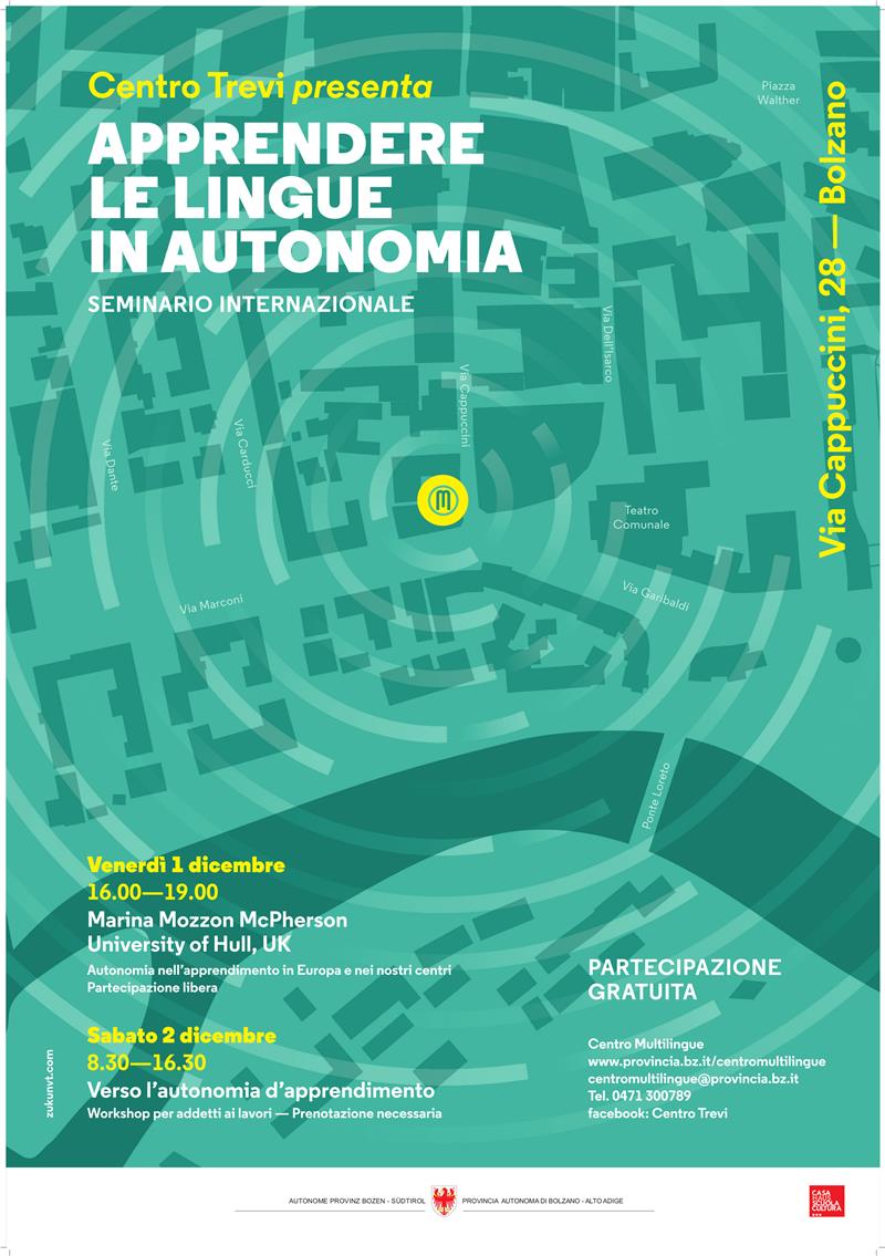 Nella giornata del 2 dicembre, ospiti provenienti da tutta Europa, tra cui la direttrice del Selbstlernzentrum della Freie Universität Berlin, Maria Giovanna Tassinari, offriranno il loro contributo all’interno di workshop tematici incentrati su esperienze in centri di autoapprendimento, consulenza linguistica, possibilità di inserire il concetto di autonomia anche in classe e strumenti utili per superare i blocchi nell’apprendimento delle lingue. Obiettivo degli workshop è la condivisione di esperienze, idee e proposte e l’individuazione di possibili scenari futuri nel campo dell’autoapprendimento delle lingue, non solo a livello accademico. La partecipazione ai workshop del sabato è gratuita ma è necessaria l’iscrizione. Per il personale insegnante viene riconosciuta come formazione. Informazioni aggiornate e dettagliate sul seminario "L'apprendimento autonomo delle lingue" sulle pagine web provinciali dedicate alla cultura. Gli incontri individuali di consulenza all’autoapprendimento continueranno presso il Centro multilingue e la Mediateca multilingue per tutto l’inverno fino alla fine dell’anno. I punti informativi dei due centri saranno arricchiti dai risultati emersi dai workshop, dai poster e dai materiali messi a disposizione dai relatori.