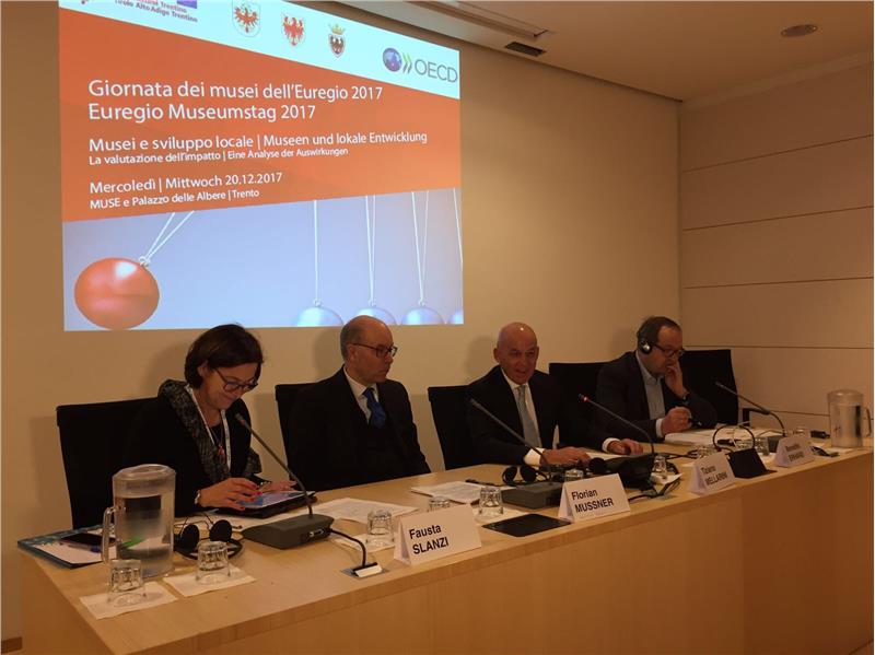 Si è svolta ieri (20 dicembre) a Trento la Giornata dei musei dell'Euregio, da molti anni piattaforma di confronto e fucina di buone pratiche da condividere nei tre territori. All'incontro ha partecipato l'assessore alla cultura della Provincia di Trento Tiziano Mellarini, il direttore di Dipartimento Valentino Pagani ha rappresentato l'assessore altoatesino Florian Mussner, mentre l'assessora tirolese Beate Palfrader è stata rappresentata dal dirigente Benedikt Erhard. La giornata è stata dedicata a sviscerare il tema "Musei e sviluppo locale" su cui si sono espressi tutti e tre i vertici culturali euroregionali. Lo spunto nasce da un prezioso lavoro che l'OECD - OCSE sta portando avanti nella convinzione che, negli ultimi anni, i musei stiano cambiando missione e costituiscano luoghi di dialogo, promuovendo conoscenza interna ai territori ed esterna, siano agenti di cambiamento economico e sociale generando, anche, posti di lavoro. Piena concordanza di prospettive, fra i vertici culturali dell'Euregio, sull'utilità del lavoro promosso da OCSE per arrivare ad una sinergia sempre più efficace fra ruolo e funzione dei musei e sviluppo locale.