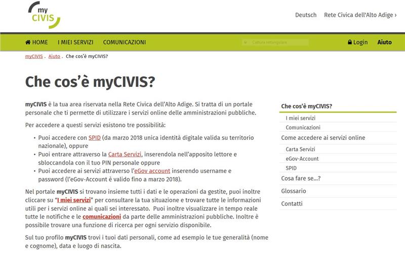 La Provincia di Bolzano è collegata al nuovo sistema dal 3 ottobre 2017. Dal primo marzo l’iscrizione a myCIVIS, l’area riservata nella Rete Civica dell’Alto Adige, potrà avvenire attraverso lo SPID o attraverso una carta servizi già attivata, inserendola nell’apposito lettore. “La digitalizzazione offre molte chance e, soprattutto, permette ai cittadini di risparmiare tempo ed evitare spostamenti non necessari. E' importante che i cittadini vengano accompagnati in questo processo fornendo i supporti necessari”, sottolinea l’assessora Waltraud Deeg, In questa direzione si muovono gli interventi previsti dalla giunta per rendere la piattaforma bilingue e per ampliare l’attività di sportello e consulenza dei provider SPID. “Vanno favorite le misure che vengono incontro alle esigenze dei cittadini, ed è di particolare importanza la possibilità di impiegare la propria lingua”, afferma il presidente della giunta, Arno Kompatscher.
