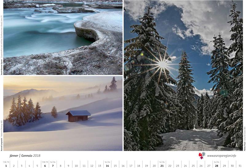 L‘Ufficio comune dell’Euregio è alla ricerca di immagini suggestive scattate nelle province di Bolzano e Trento, e in Tirolo, durante l'autuno e l'inverno. L'obiettivo è quello di dare vita così, con il contributo dei cittadini, al calendario 2019. Tutti i residenti nel territorio euroregionale sono invitati a inviare fino ad un massimo di quattro foto per le stagioni inverno e autunno – per un totale massimo di 8 foto - entro il 15 aprile 2018 e ad allegare anche una propria foto. Può partecipare chiunque riempia il formulario presente sul sito web dell’Euregio e carichi le proprie foto. L'invito è quello di caricare foto nella più alta risoluzione possibile e di corredarle con dati e informazioni sulla motivazione che ha fatto nascere lo scatto.