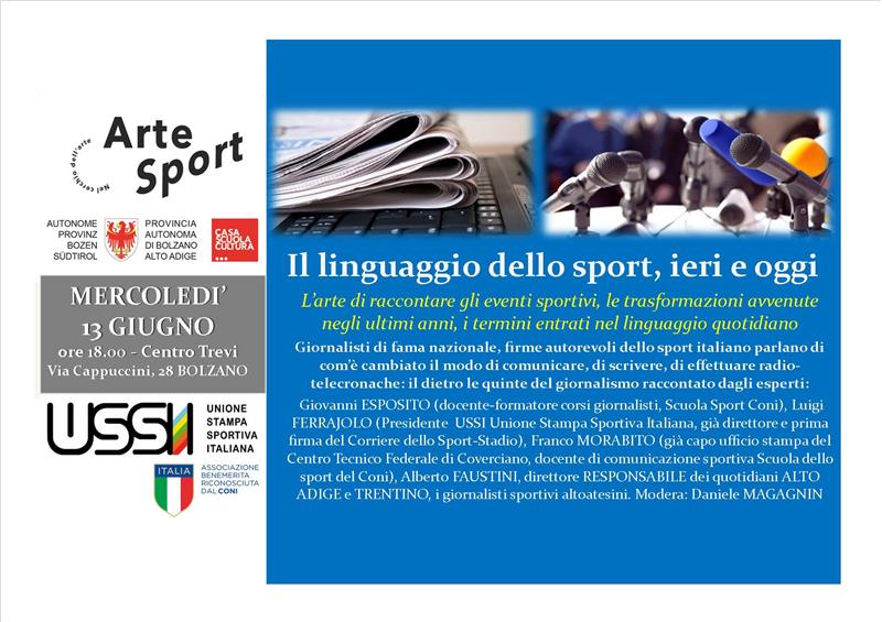Proseguono gli eventi collaterali alla mostra “ArteSport”, promossa dall’Ufficio cultura italiana della Provincia e inaugurata lo scorso 21 marzo al Centro Trevi di Bolzano. Dopo gli “artisti della bicicletta” messi in risalto attraverso la storia del Giro d’Italia narrata da Stefano Pivato e i racconti degli ex professionisti altoatesini del pedale, il nuovo appuntamento è dedicato, invece, a com’è cambiato il linguaggio narrativo dei media negli ultimi anni, in particolare nel raccontare lo sport e come i termini in uso nel lessico sportivo siano entrati prepotentemente nel linguaggio quotidiano. “Il linguaggio dello sport, ieri e oggi" è in calendario mercoledì 13 giugno alle ore 18 sempre al Centro Trevi. Protagonisti dell’evento saranno giornalisti-formatori e firme autorevoli dello sport italiano chiamati a parlare di com’è cambiato il modo di comunicare, di scrivere, di effettuare radio-telecronache: una sorta di dietro le quinte del giornalismo raccontato dagli esperti.