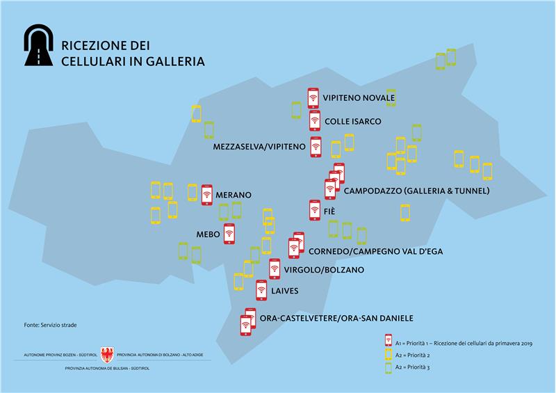 Gli studi svolti nel settore, infatti, confermano che in situazioni di stress e di pericolo, le persone preferiscono affidarsi al proprio apparecchio telefonico anzichè utilizzare le colonnine degli SOS presenti lungo la carreggiata. Tutto ciò senza considerare che da un lato le auto più moderne sono dotate di sistemi automatici di allarme che contattano i numeri di emergenza, e che dall'altro l'utilizzo dei sistema di navigazione richiede sempre una copertura tramite dati mobile. "Con questi interventi - aggiunge l'assessore al Servizio strade, Florian Mussner - garantiamo una maggiore sicurezza a chi percorre i numerosi tunnel presenti in Alto Adige". A tal proposito, il Servizio strade ha elaborato una lista di priorità delle gallerie all'interno delle quali non è ancora presente una copertura con rete mobile. "La lista è suddivisa in categorie a seconda della lunghezza e della mole di traffico - sottolinea il direttore del Servizio strade, Philipp Sicher - e con questo bando ci occupiamo dei tunnel più importanti ancora sprovvisti di copertura".