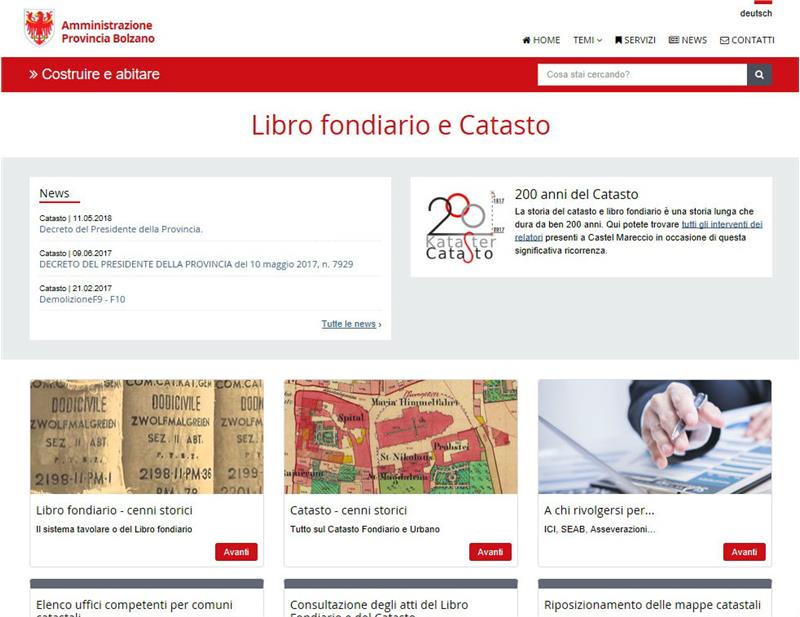 Grazie al potente motore di ricerca GSA (Google Search Appliance) i contenuti sono facilmente accessibili. La pagina Internet è programmata in modo "responsive": le informazioni assumono automaticamente l'impaginazione più adatta alla lettura a seconda del mezzo impiegato dall'utente, sia esso un computer, un tablet, uno smartphone o un e-reader. Il nuovo portale web è stato realizzato dalla Ripartizione provinciale Libro fondiario, catasto fondiario e urbano in collaborazione con Informatica Alto Adige Spa.