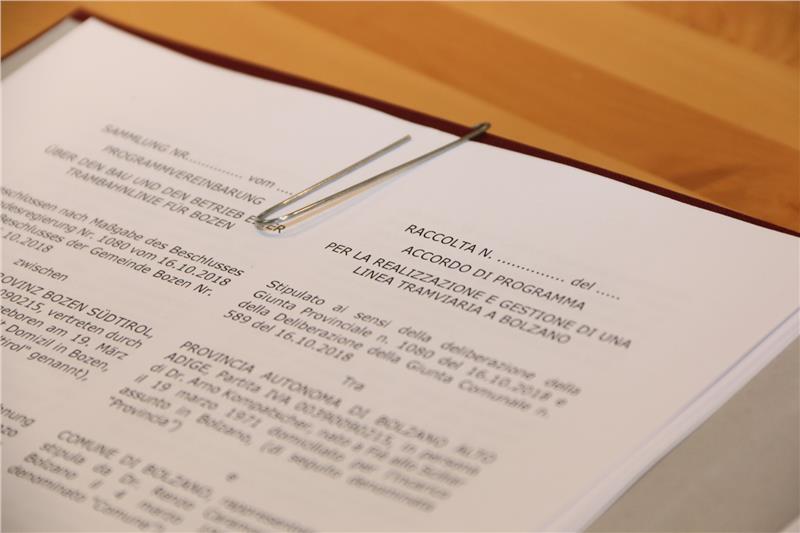 Nuovo passo in avanti per la realizzazione della linea di tram che si pone come obiettivo a lungo termine quello di contribuire a decongestionare la città di Bolzano dal traffico, in maniera particolare quello legato ai pendolari. L'accordo di programma, approvato martedì scorso dalla Giunta provinciale, è stato sottoscritto questa mattina (19 ottobre) a Palazzo Widmann dal presidente della Provincia, dal sindaco del capoluogo e dai presidenti di SASA e STA (Strutture trasporto Alto Adige). A proposito di STA, è notizia proprio delle ultime ore la deliberazione di uno stanziamento di 1,2 milioni di euro per partire con la fase di progettazione dell'opera. "Finalmente si passa dalle parole ai fatti - ha commentato il Landeshauptmann - Bolzano attende da anni una soluzione ai problemi legati alla viabilità, e ritengo che il tram possa finalmente sgravare la città da una buona fetta del traffico che quotidianamente la attraversa. La firma di oggi rappresenta un atto formale di fondamentale importanza in quanto mette nero su bianco la suddivisione dei compiti e dei costi legati a progettazione, finanziamento, realizzazione e gestione del tram, progetto che contribuirà a migliorare la qualità di vita dei bolzanini. Una volta completata, la linea potenzierà in maniera decisiva l'offerta di trasporto pubblico in città trasferendo parte del traffico da gomma a rotaia. Grazie alle interconnessioni previste con treni e bus a livello urbano ed extraurbano, e alla possibilità di prolungamento del percorso verso l'Oltradige, il tram diventerà uno dei pilastri di una offerta di mobilità pubblica sempre più improntata alla sostenibilità".