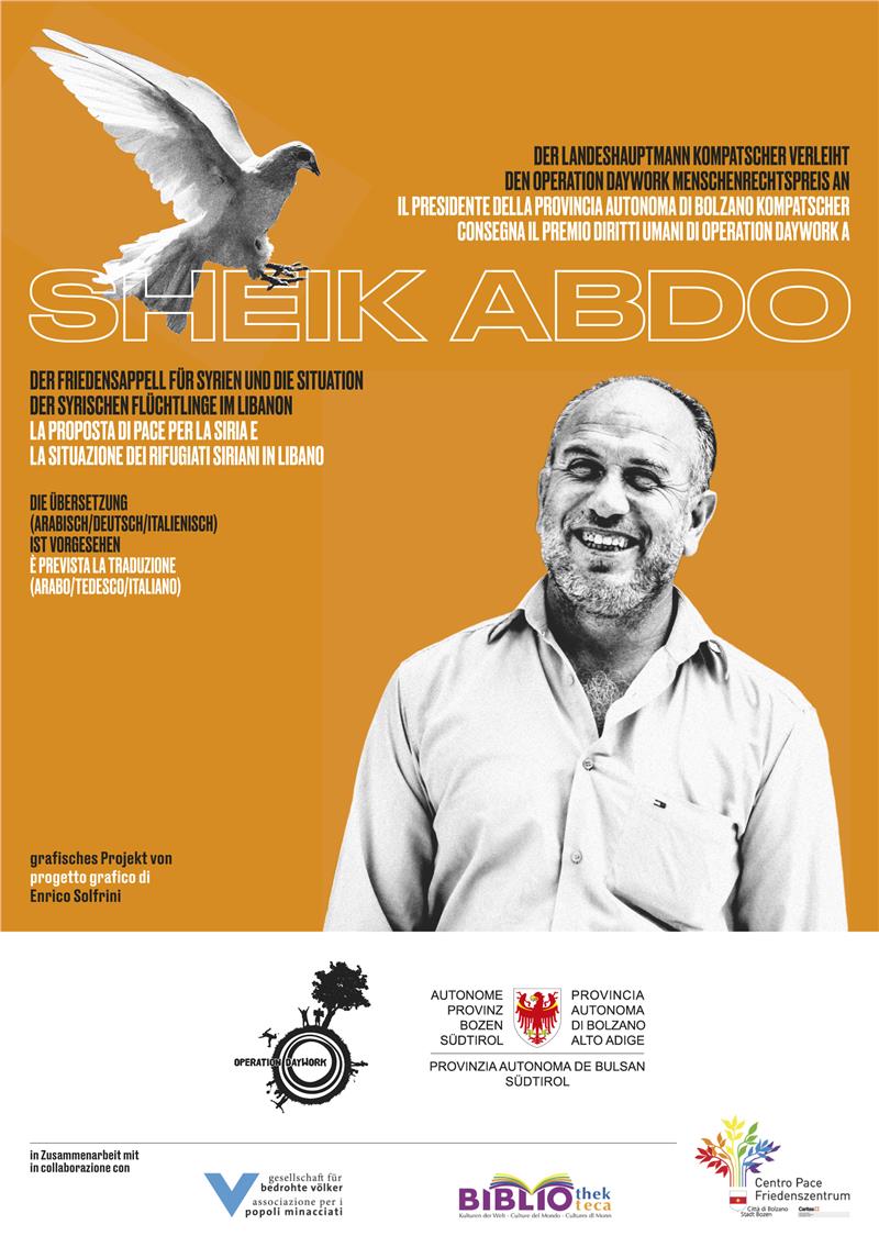 Sheik Abdo viene dal sud della Siria, nelle vicinanze di Homs, dove ha lavorato inizialmente come maestro elementare. Con lo scoppiare delle manifestazioni contro il regime di Bashar Al-Asad, nel marzo 2011, istituisce così una clinica per il trattamento dei feriti nelle manifestazioni civili di protesta, impossibilitati a ricevere cure da parte del sistema sanitario istituzionale. Nell’agosto del 2011 Sheik Abdo scopre di essere ricercato dalle forze governative siriane e assieme alla moglie, lascia la Siria e si reca nel nord del Libano dove nel 2012 apre una clinica gratuita per curare i siriani malati e feriti in Akkar. Le autorità libanesi dopo alcuni mesi hanno richiesto la chiusura della piccola clinica informale. Nel 2013, Sheik Abdo fonda un’associazione di auto mutuo aiuto laica e apartitica, Al-Ihsan, composta da attivisti siriani e libanesi di diverse comunità, unite dall'obiettivo di aiutare i siriani sfollati. Parte così anche il progetto del Malaak Center, un centro scolastico che accoglie oggi 460 studenti tra i 3 ed i 17 anni e 14 insegnanti, che è anche un centro di riabilitazione psicologica per bambini. Dal 2015 Sheik Abdo è portavoce della "Proposta di pace per la Siria", un appello redatto con l’associazione Operazione Colomba all’interno delle tendopoli dell’Akkar. Le richieste sono la creazione di una zona umanitaria in Siria, la fine dei bombardamenti e della fornitura di armi, un governo di unità nazionale che rappresenti tutti i siriani, una rappresentanza civile alle trattative di pace di Ginevra, un cambio di rotta nella lotta all’estremismo e una pronta assistenza alle vittime. Dal 2017 ad oggi Sheik Abdo ha raccolto sostegno internazionale alla sua proposta e l’8 dicembre scorso ha incontrato il Presidente della Repubblica Sergio Mattarella.