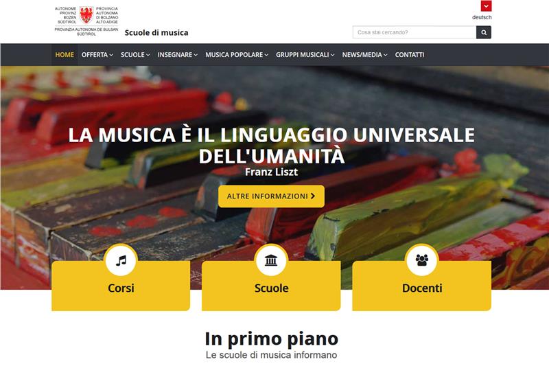 Il nuovo portale web delle scuole di musica, suddiviso nelle sezioni corsi, scuola e docenti, fa parte del progetto di ammodernamento e rinnovamento di tutta la presenza dell'amministrazione provinciale sul web. Le pagine sono state realizzate con un design responsive che consente di adattare automaticamente la visualizzazione in base allo strumento con il quale si naviga (pc, tablet, smartphone, ecc.), e possono contare su un potente motore di ricerca interno che rende più semplice e rapido giungere ai contenuti desiderati. Il portale web è stato realizzato in collaborazione fra le scuole di musica, la Ripartizione informatica e Informatica Alto Adige.