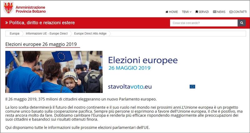 Perché si vota? Come si vota? Quando si vota? Sono alcune delle domande a cui cerca di dare una risposta il nuovo portale web sulle elezioni europee del 26 maggio 2019 che rinnovano il Parlamento della UE. All'interno del portale, curato da Europe Direct, il centro di informazione ufficiale della UE in Alto Adige, si trovano anche una serie di brochure e pubblicazioni sulle elezioni, sull'Unione Europea e sul Parlamento europeo che possono essere scaricati gratuitamente. Inoltre, il sito pubblicherà tutti gli eventi che si svolgeranno in Alto Adige nel periodo che precede le elezioni. Chiunque organizza un evento di questo tipo può inviarlo a europedirect@provincia.bz.it per la pubblicazione.
