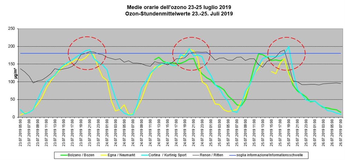 Anche ieri, prima dell'arrivo dei temporali, sforata la soglia di informazione di ozono a Cortina sulla strada del vino e sul Renon. La situzione dovrebbe tornare nella norma.