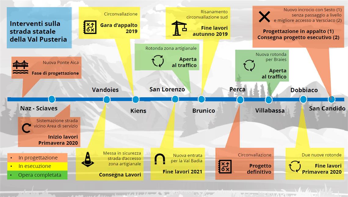Sono state completate due nuove rotatorie, quella nei pressi dello svincolo per la val di Braies e quella nei pressi della zona artigianale fra Brunico e S. Lorenzo di Sebato, che possono convogliare meglio i flussi di traffico. Altre due nuove rotatorie a Dobbiaco, attualmente in fase di costruzione, dovrebbero essere pronte entro il 2020 e andare a sostituire due snodi rendendo più fluido il transito. La circonvallazione sud di Brunico è in fase di risanamento: per settembre dovrebbe essere rinnovato l’asfalto affinché la strada sia più sicura in caso di pioggia. Procedono a pieno ritmo i lavori per il nuovo accesso alla val Badia nei pressi di S. Lorenzo di Sebato, che dal 2021 consentirà l’ingresso diretto alla valle senza incrocio per i flussi di pendolari e turisti. L’opera consentirà di alleggerire il traffico di transito a S. Lorenzo di Sebato e a Floronzo. Stanno per essere consegnati i lavori per migliorare la sicurezza del nuovo imbocco per la zona produttiva di Vandoies., e verranno realizzate anche due nuove varianti, quella di Chienes e quella di Perca, che contribuiranno a migliorare la qualità di vita nei due centri. Per la circonvallazione di Chienes i lavori potranno essere appaltati entro il 2019, mentre per la circonvallazione di Perca è in fase di predisposizione il progetto definitivo. A breve verrà consegnato il progetto esecutivo per per un accesso con maggiore visibilità verso Versciaco di Sopra e pubblicata la gara di progettazione per un incrocio più sicuro verso Sesto Pusteria senza passaggio a livello ferroviario. Un altro intervento sarà eseguito nei pressi dell’area di sosta a Naz Sciaves al fine di ridurre le code e migliorare la sicurezza di transito.