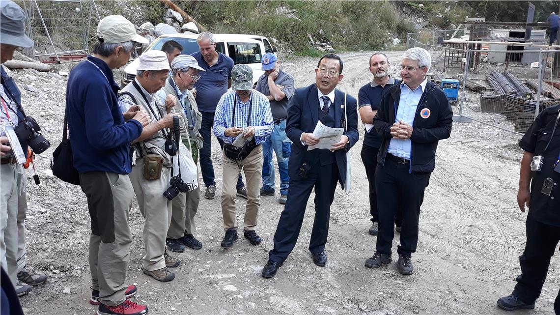Insieme a Sandro Gius, direttore dell'Ufficio sistemazione bacini montani est dell'Agenzia per la protezione civile e il direttore dell’Ufficio geologia e prove materiali della Provincia Volkmar Mair, il gruppo ha visitato un manufatto di protezione ad Hahnebaum nel comune di Moso in Passiria. Prima della visita il direttore dell'Agenzia per la Protezione civile della Provincia Rudolf Pollinger ha fornito ai membri del gruppo giapponese una breve panoramica dell'Alto Adige e dell'Agenzia stessa. Successivamente, Volkmar Mair ha spiegato la geologia dell'area con lo storico delle frane della zona.